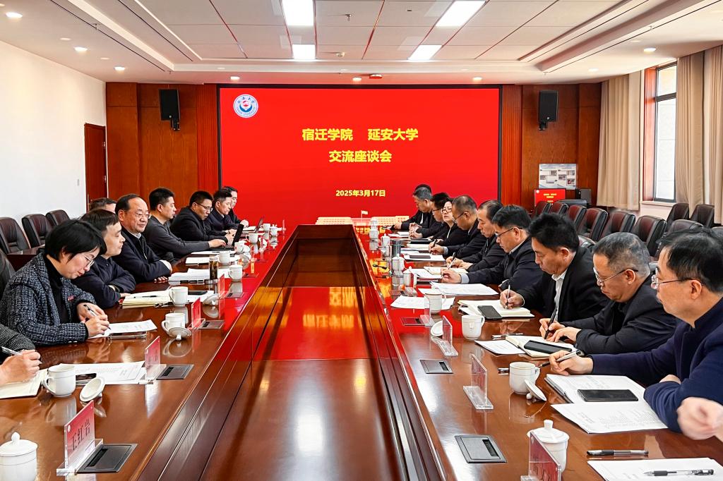 会上,徐德简要介绍宿迁学院改革创新发展历程,他指出,宿迁学院的地方性、综合性、创新性后发性等基本属性与延安大学有很多共同之处,希望双方在思政教育、学科建设、研究生联合培养方面携手共进。高子伟对徐德一行的来访参观交流表示诚挚的欢迎,他从延安大学的发展、新校区建设、研究生培养历程、学科优势特色等方面做了介绍,希望两校能够互通有无、互相补充、互相学习,尤其是在智能化、优势学科专业、学校管理等方面加强学习交流。