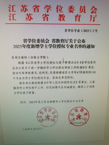 日前,江苏省学位委员会、江苏省教育厅发布《省学位委员会省教育厅关于公布2025年度新增学士学位授权专业名单的通知》,我校金融科技、化学、新能源汽车工程、智能建造4个专业顺利通过新增学士学位授权审核,获得学士学位授予权。