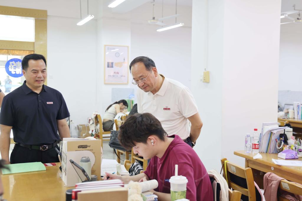 在求索楼,徐德详细了解了留校考研学生的学习状态。他指出,求索楼是暑期人员最密集的地方,要注意经常通风,防止人员中暑;要全面排查楼内水电安全、密切关注留校学生心里健康状态,各学院要轮流安排人员值班值守,每天动态巡查;医务室、后勤处要将暑期工作重点聚焦在求索楼,做好服务保障。