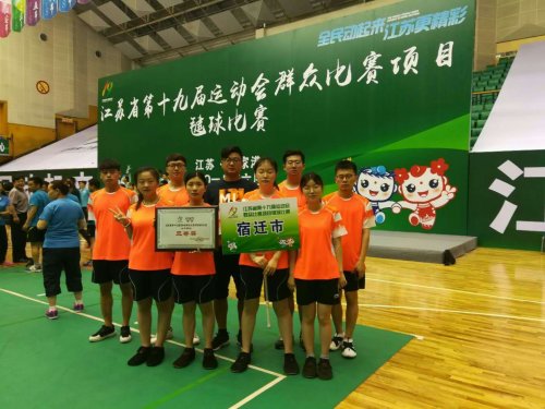 江苏省第十九届运动会群众组毽球比赛在张家港市体育馆举行。我校大学生毽球队受宿迁市民宗局委托代表宿迁市参赛,在与众多民间高手和高水平运动员对抗中突破重围进入八强,最终获得三等奖。