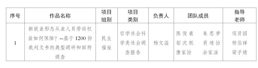 根据《“挑战杯”全国大学生课外学术科技作品竞赛章程(试行)》有关规定和2023年第十八届“挑战杯”全国大学生课外学术科技作品竞赛江苏省选拔赛评选结果,我校《新就业形态从业人员劳动权益如何保障?--基于1200份裁判文书的典型调研和田野调查》荣获江苏省选拔赛特等奖并代表江苏省参加第十八届“挑战杯”全国大学生课外学术科技作品竞赛,现将作品信息公示如下: