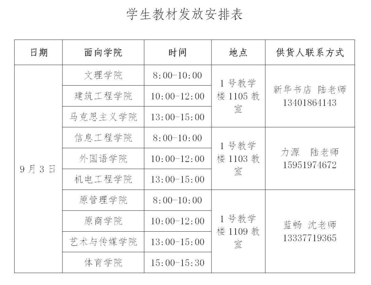 根据期初工作安排,将于9月3日上午08:00开始面向各学院学生发放教材,各学院具体领取时间见下表。具体工作安排: