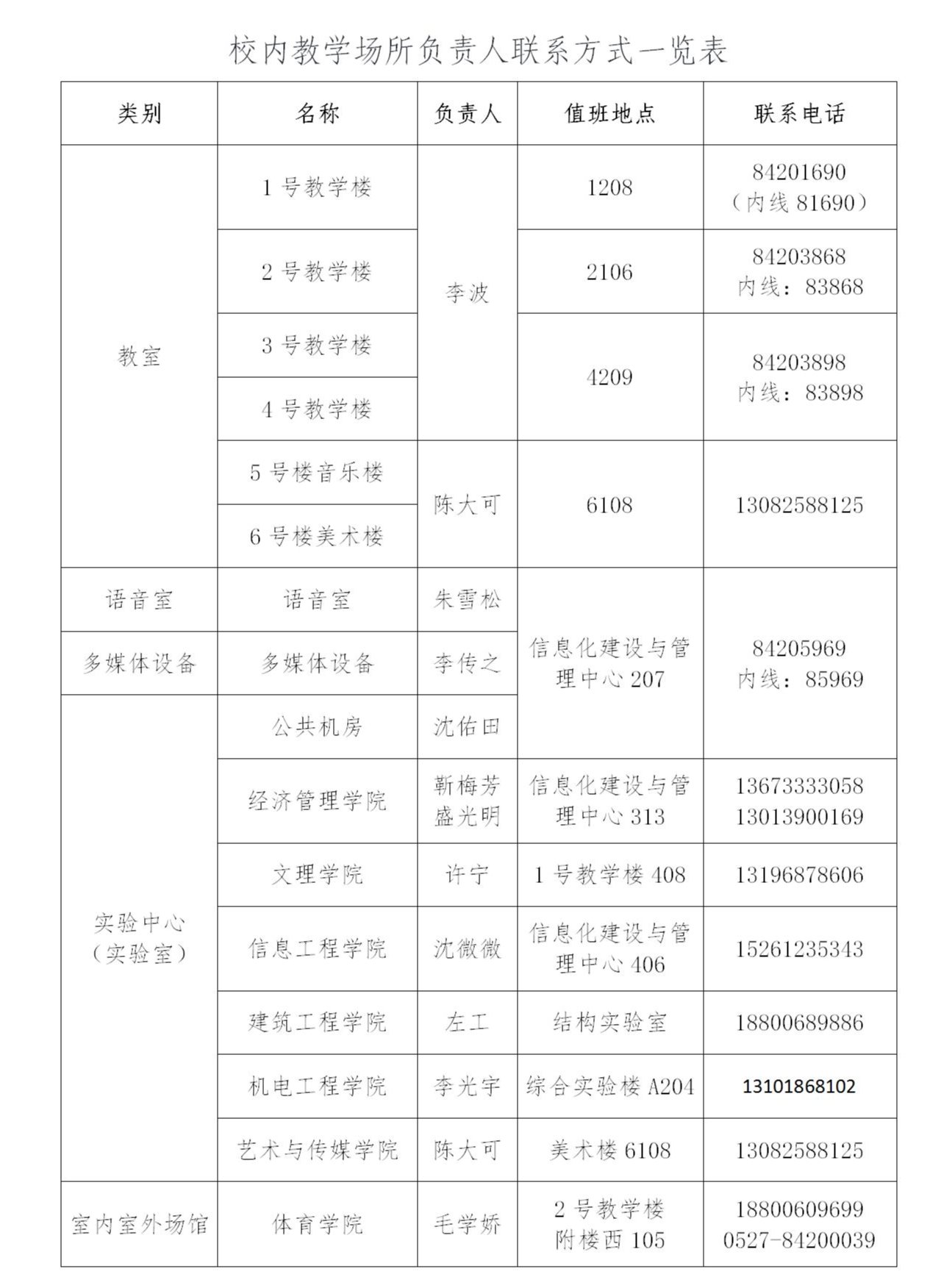 (四)在多媒体教室、语音室、实验室上课的教师,应至少提前一天至相关教室或实验室查看软硬件环境是否满足上课要求,检查有关设备的运行情况,如发现问题,及时与相关管理人员联系解决。校内教学场所负责人联系方式如下表所示: