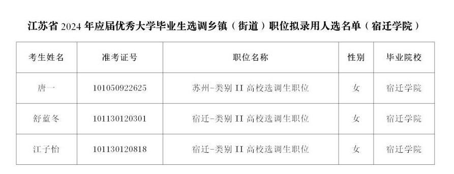 附件:江苏省2024年应届优秀大学毕业生选调乡镇(街道)职位拟录用人选名单(宿迁学院)