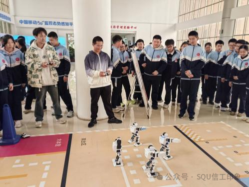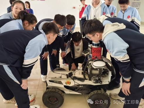活动现场,崇文初中的同学们有序分组投入活动中。在信息化建设与管理中心一楼展厅,机器人跳舞、竞技表演、蛋鸡、巡检机器人、恒温箱、轮椅等科研作品牢牢吸引着同学们的目光。在实验室,先进的设备,科研领域的成果,调动了同学们的求知欲,志愿者们耐心解答同学们的提问。