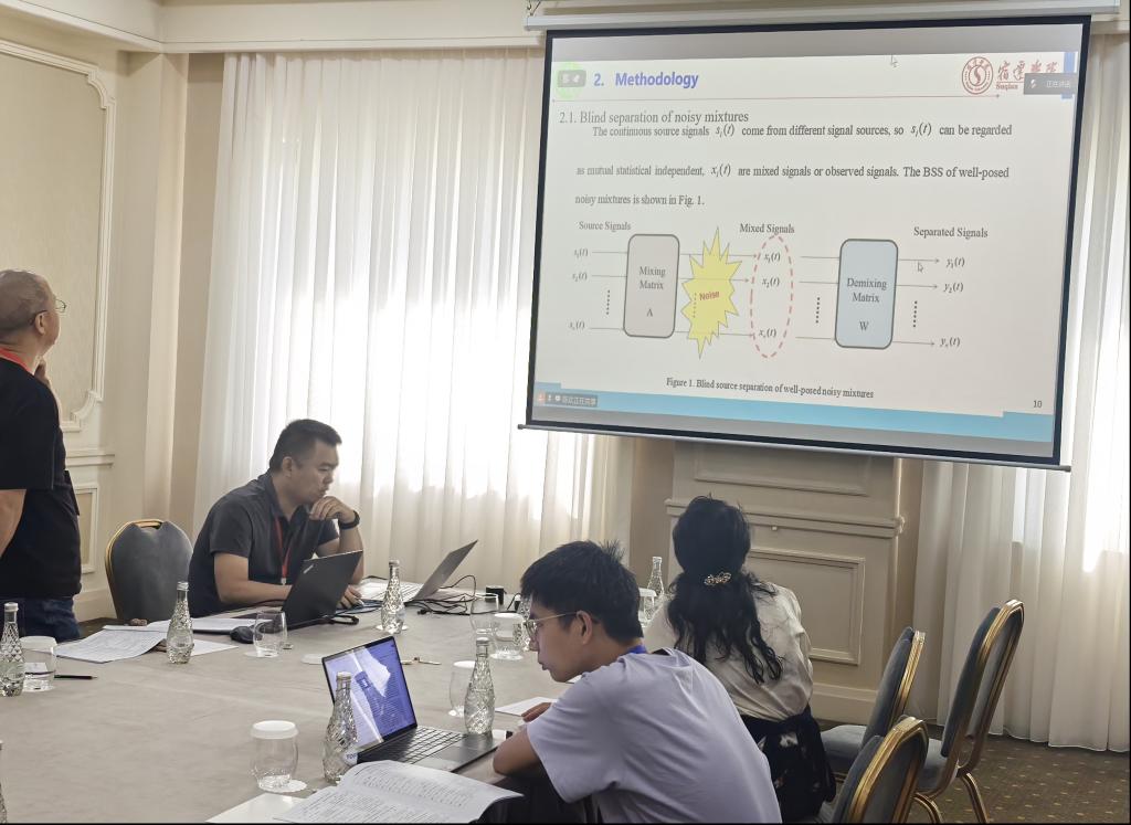 许鹏飞与教授Yuanyu Zhang联袂主持的“无线网络”专题会议现场学术氛围浓烈,他分享的可见光通信盲源分离研究成果引发了广泛关注,其创新性地采用了高斯平滑处理和简化成本函数,有效提升了通信系统的抗噪性能,特别是在高信噪比环境中有显著优势。