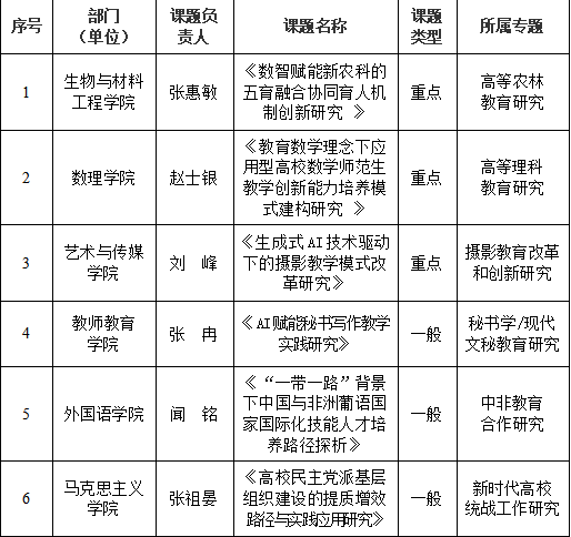 近日,中国高等教育学会发布了《关于公布“2025年度高等教育科学研究规划课题”立项名单的通知》,我校6项课题获批立项,其中重点课题3项,一般课题3项。