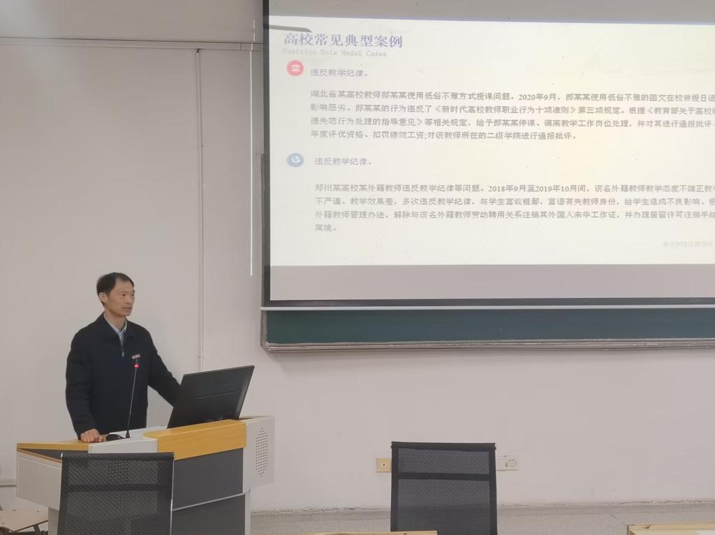 副院长刘尚礼带领全体参会人员深入学习了习近平总书记关于教育的重要论述;张华文结合教育部公开曝光的师德师风负面典型案例开展警示教育;