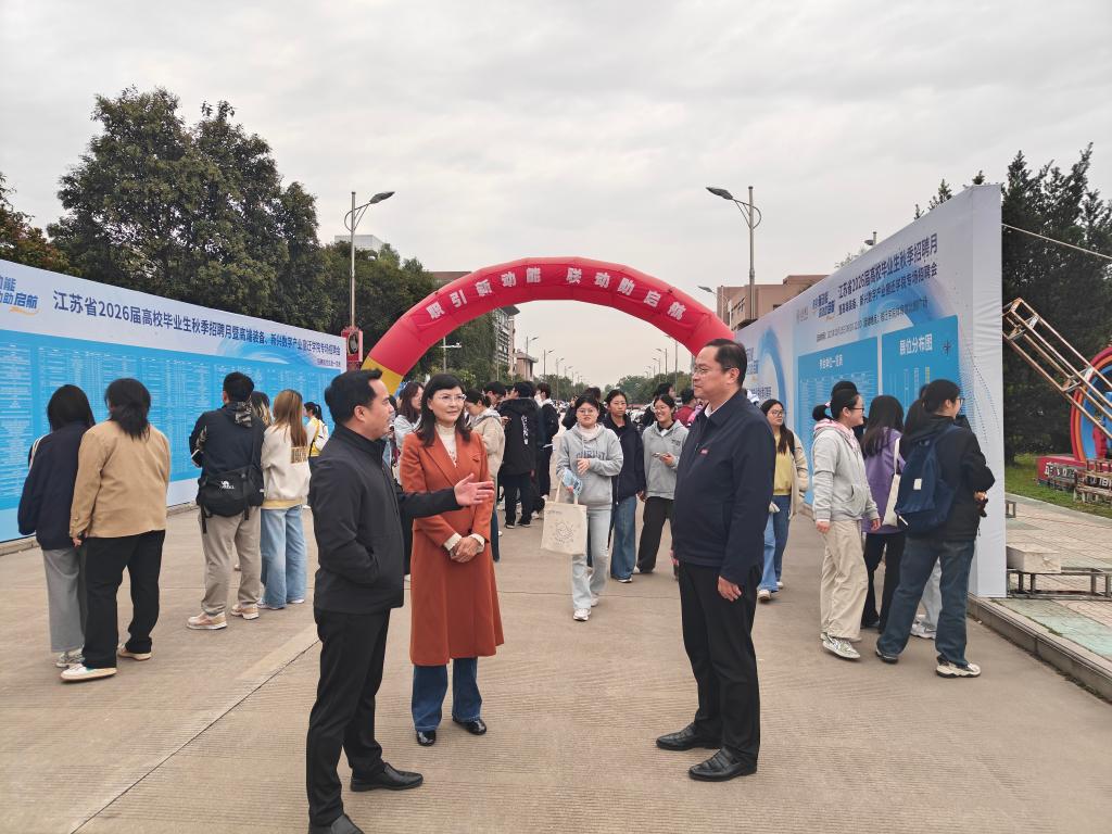 为重点围绕江苏省“1650”现代化产业体系,引导毕业生争当新质生产力生力军,促进毕业生高质量充分就业,近日,由江苏省教育厅、江苏省人力资源和社会保障厅、江苏省工业和信息化厅、江苏省政府国有资产监督管理委员会、江苏省工商业联合会主办,江苏省高校招生就业指导服务中心、江苏省劳动就业管理中心、江苏省职业介绍中心和我校承办的“职引新动能联动助启航”江苏省2026届高校毕业生秋季招聘月暨高端装备、新兴数字产业宿迁学院专场招聘会在体育馆北侧广场顺利举行,校党委常委、副校长许立春到招聘会现场指导就业工作。