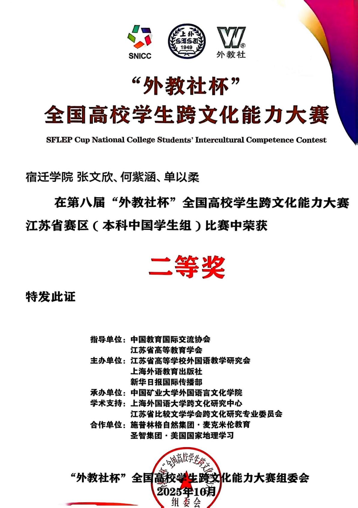 10月25日至26日,第八届“外教社杯”全国高校学生跨文化能力大赛江苏省赛区比赛在中国矿业大学举办。在我校外国语学院牛春原、曹盈、王善江老师的指导下,由英语专业张文欣、汉语言文学(师范)专业何紫涵、思想政治教育(师范)专业单以柔三位同学组成的代表队发挥出色,荣获二等奖。