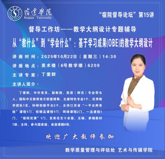 10月22日下午,“宿院督导论坛”第15讲在美术楼6209会议室成功举行,本次论坛由教学质量管理与评估处、艺术与传媒学院联合举办,特邀校督导丁爱群担任主讲专家,艺术与传媒学院副院长杨柳松出席活动,教学质量管理与评估处处长曹盈主持活动。