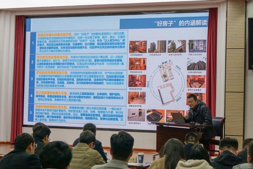 活动特邀校内外5位专家围绕生态修复、住房建设、更新规划、韧性城市、文脉传承等核心领域进行主题报告分享。中国矿业大学王林秀教授提出“融合共生、多维赋能”生态修复路径,是适配国家战略与地方需求的完整生态治理方法论,并以徐州采煤塌陷地治理为典型范例,为资源型城市转型提供了可复制方案;江苏省规划设计集团嵇卫东副院长解读新时代“好房子”理念,强调好房子是集安全、舒适、绿色、智慧于一体的系统工程,需联动城市规划与配套设施建设;江苏省规划设计集团更新规划设计院黄伟副总设计师系统梳理城市更新规划实施体系,提出“专项规划—片区策划—项目实施方案”三层次架构,并结合多地案例剖析更新项目的资金平衡与落地逻辑;江苏省城镇化和城乡规划研究中心何常清主任聚焦韧性城市建设,从设施、空间、管理三个维度提出风险防控与应急保障路径;我校教师张福贵依托宿迁“两河之间、厅堂聚心”的空间结构,提出以“楚汉雄风、迁城未央、三台锦绣、黄运安澜”为文化内核,通过构建连续性文明叙事、强化地方性知识普及、推动社区融合,打造“幸福十里”更新带,实现历史文脉与现代城市发展的深度共生。