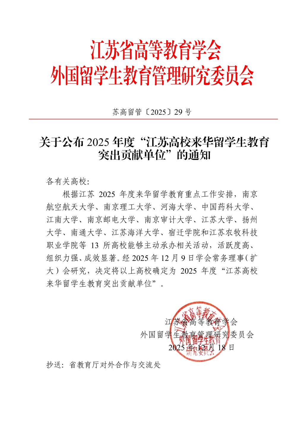近日,江苏省高等教育学会外国留学生教育管理研究委员会发布《关于公布2025年度“江苏高校来华留学生教育突出贡献单位”的通知》(苏高留管〔2025〕29号)。我校成功入选2025年度“江苏高校来华留学生教育突出贡献单位”。