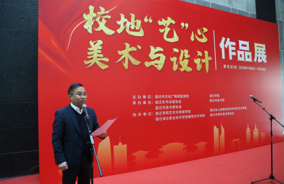 开幕式上,艺术与传媒学院副院长初健首先介绍了展览筹备情况。本次展览展期自2026年1月8日起至1月19日,首展结束后还将在驻宿高校开展巡展,形成了校地联动、校校协同的良好艺术交流生态,参展作品艺术质量高、品类多元,涵盖美术、书法、设计三大类别,集中展现了创作者的艺术思考与对西楚文化的深刻感悟。