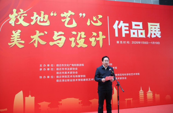 1月8日,第四届校地“艺”心美术与设计作品展在宿迁市美术馆开幕。展览由宿迁学院和宿迁市文化广电和旅游局共同主办,是校地融合协同育人的具体行动。校党委常委、宣传部部长李明建,宿迁市文化广电和旅游局党组书记、局长张智超,二级调研员王莉,宿迁市画院院长张凡,宿迁市美术家协会主席臧成贤等出席活动。开幕式由艺术与传媒学院党委副书记(主持工作)乔永刚主持。