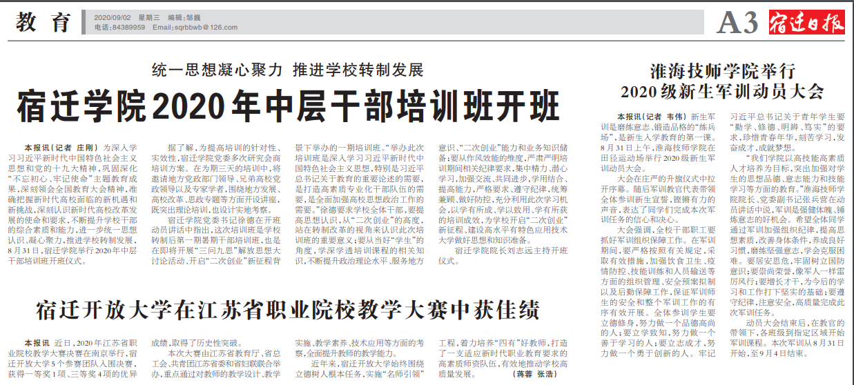 本报讯(记者 庄刚)为深入学习习近平新时代中国特色社会主义思想和党的十九大精神,巩固深化“不忘初心、牢记使命”主题教育成果,深刻领会全国教育大会精神,准确把握新时代高校面临的新机遇和新挑战,深刻认识新时代高校改革发展的使命和要求,不断提升学校干部的综合素质和能力,进一步统一思想认识、凝心聚力,推进学校转制发展,8月31日,宿迁学院举行2020年中层干部培训班开班仪式。