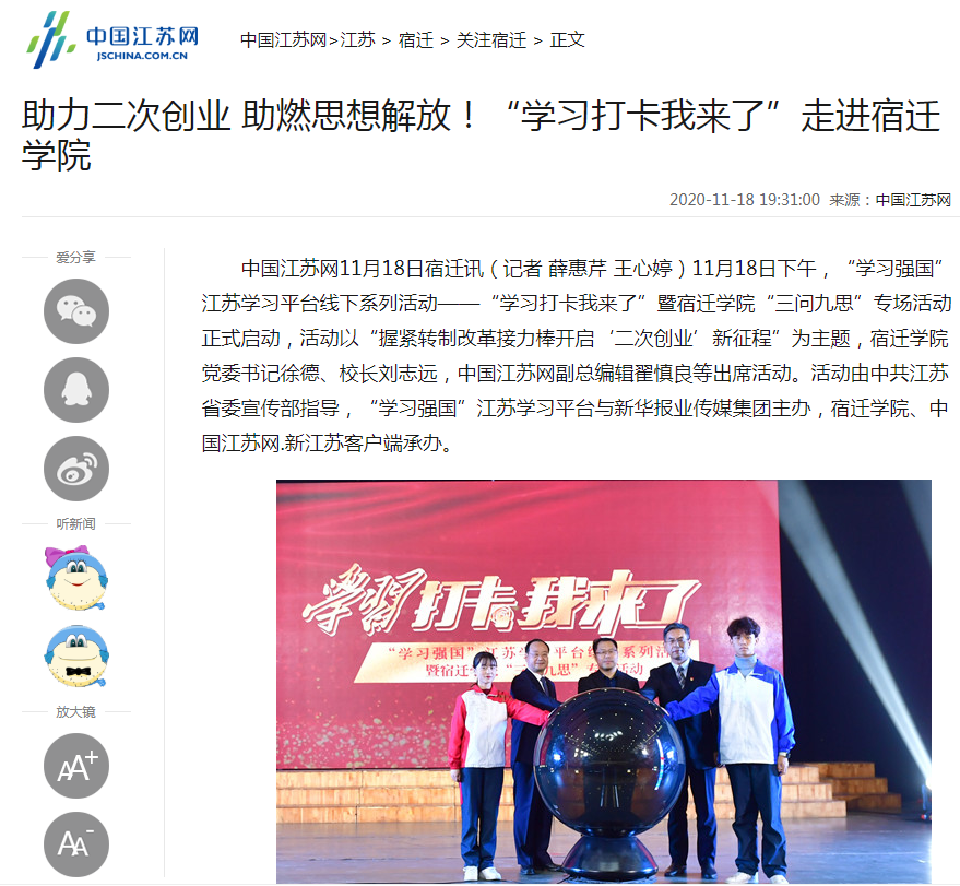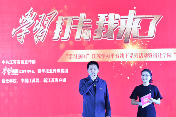 新江苏.中国江苏网讯(记者 薛惠芹 王心婷)11月18日下午,“学习强国”江苏学习平台线下系列活动——“学习打卡我来了”暨宿迁学院“三问九思”专场活动正式启动,活动以“握紧转制改革接力棒开启‘二次创业’新征程”为主题,宿迁学院党委书记徐德、校长刘志远,中国江苏网副总编辑翟慎良等出席活动。活动由中共江苏省委宣传部指导,“学习强国”江苏学习平台与新华报业传媒集团主办,宿迁学院、中国江苏网.新江苏客户端承办。