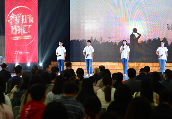 此次活动,将线上的自主学习延伸至线下,活动现场还设置了火热的知识竞答环节,通过3轮9道题目的问答,考验现场观众对于“学习强国”学习平台挑战答题以及宿迁学院“三问九思”解放思想大讨论活动的熟悉程度。