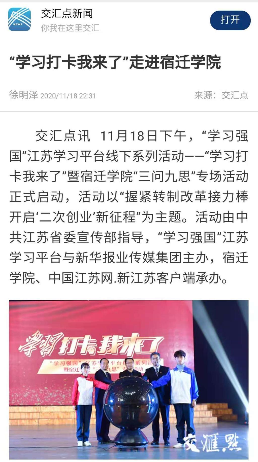 交汇点讯 11月18日下午,“学习强国”江苏学习平台线下系列活动——“学习打卡我来了”暨宿迁学院“三问九思”专场活动正式启动,活动以“握紧转制改革接力棒 开启‘二次创业’新征程”为主题。活动由中共江苏省委宣传部指导,“学习强国”江苏学习平台与新华报业传媒集团主办,宿迁学院、中国江苏网.新江苏客户端承办。