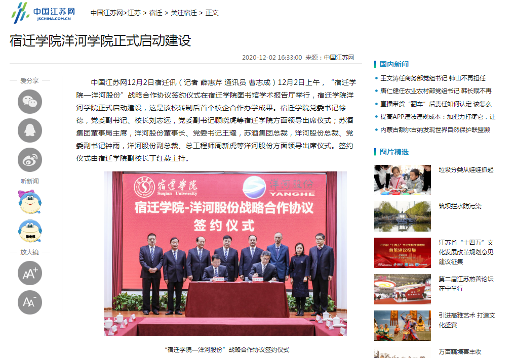 “宿迁学院—洋河股份”战略合作协议签约仪式
