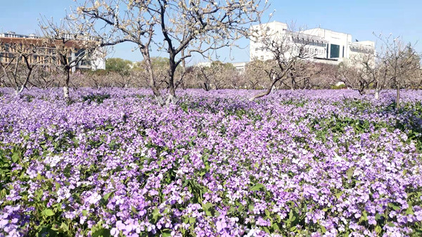 中国江苏网3月28日宿迁讯 连日来,宿迁学院桃李园内的二月兰灿烂盛开,吸引了广大师生前来“打卡”,也让社会各界因为疫情防控不能身临其境深感遗憾。这一值得胜日寻芳之地,是该校师生亲手开垦和播种的结晶,也是学校“花样”劳动教育的又一次美好呈现。