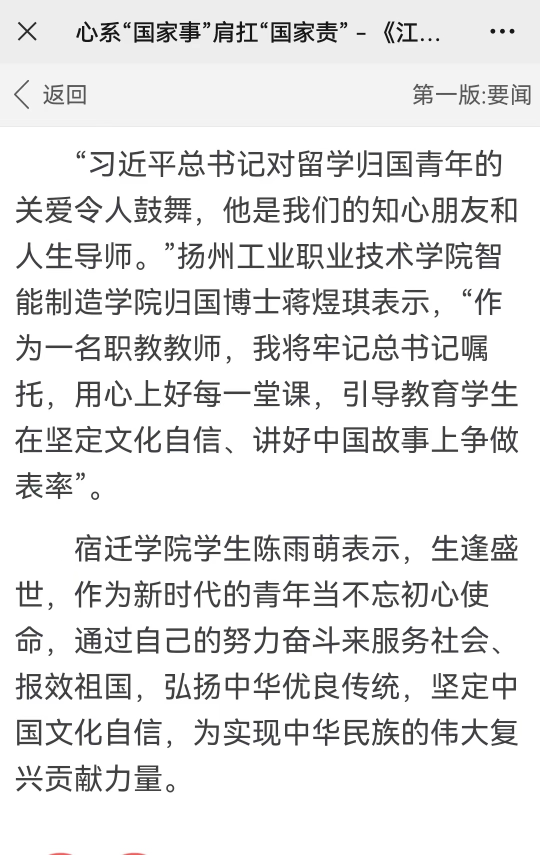 5月20日江苏教育报专题报道习近平总书记给南京大学留学归国青年学者的回信引发的热烈反响,我校陈雨萌同学的心得被采用。