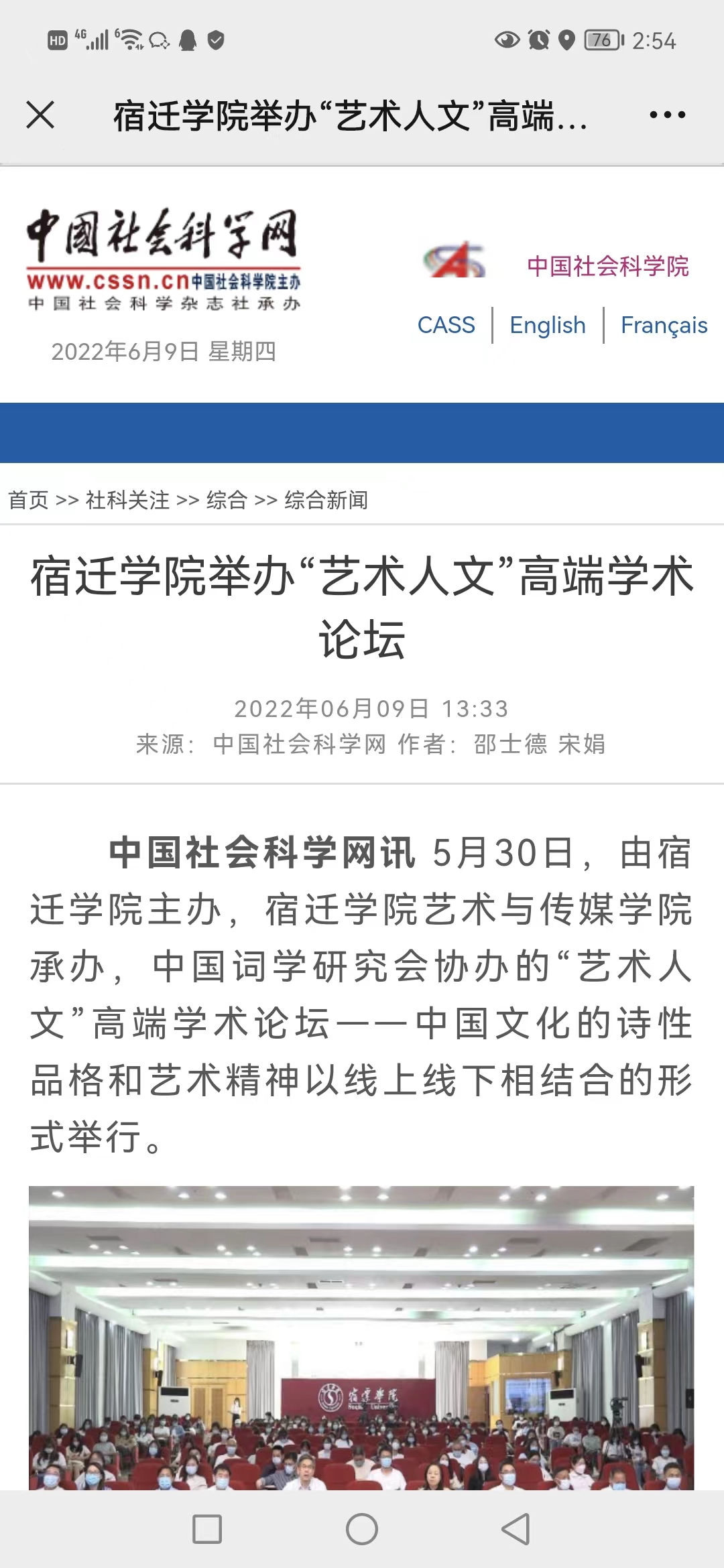 6月9日,中国社会科学网(中国社会科学院主办)《社科关注》栏目,以《宿迁学院举办“艺术人文”高端学术论坛》为题,对我校进行宣传报道。