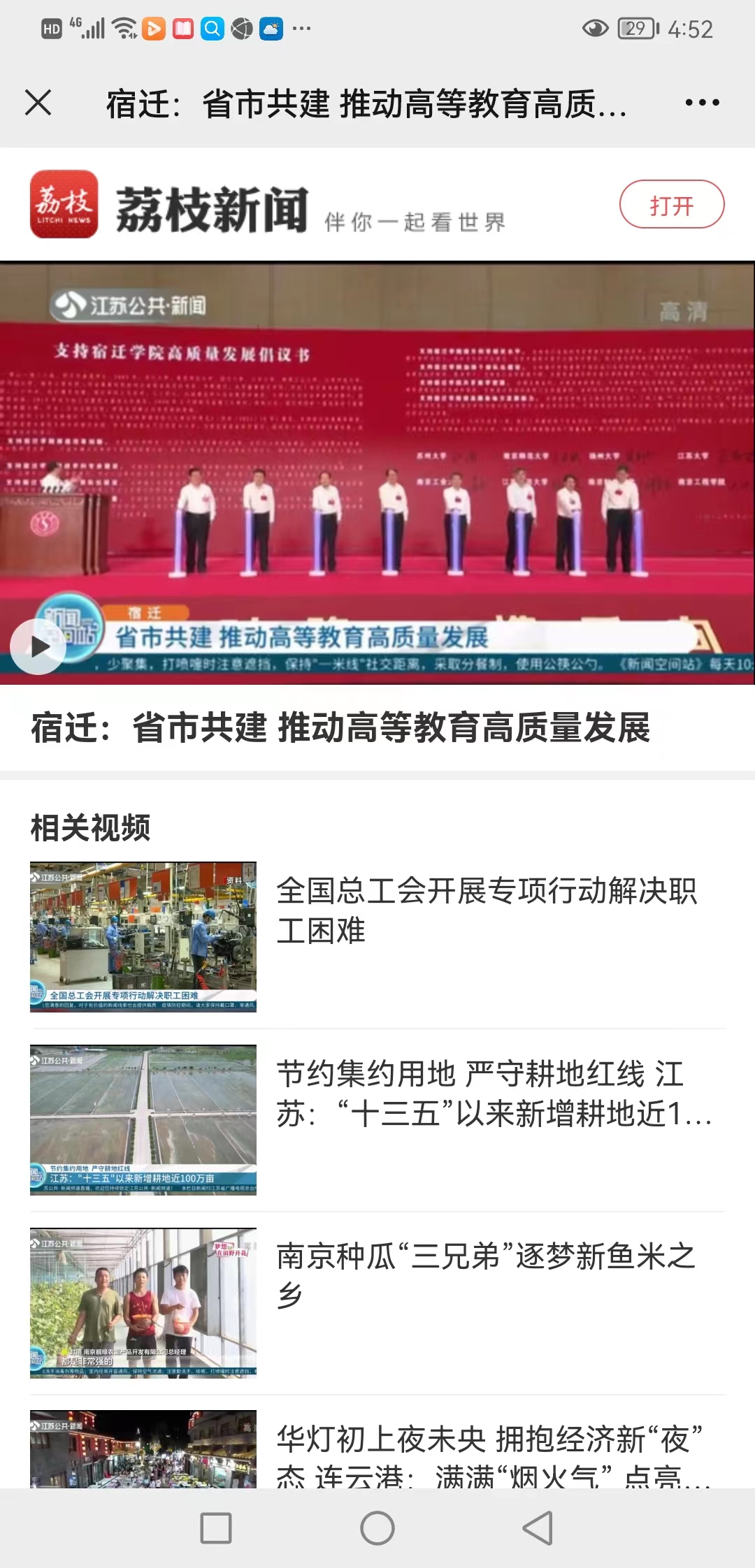 6月26日荔枝新闻、江苏卫视公共频道以《宿迁:省市共建 推动高等教育高质量发展》为题播发我校建校20周年创新发展大会相关新闻,截图如下: