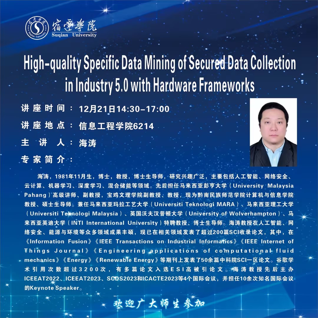 信息工程学院“信习研”大讲堂:High-quality Specific Data Mining of Secured Data Collection in lndustry 5.0 with Hardware Frameworks